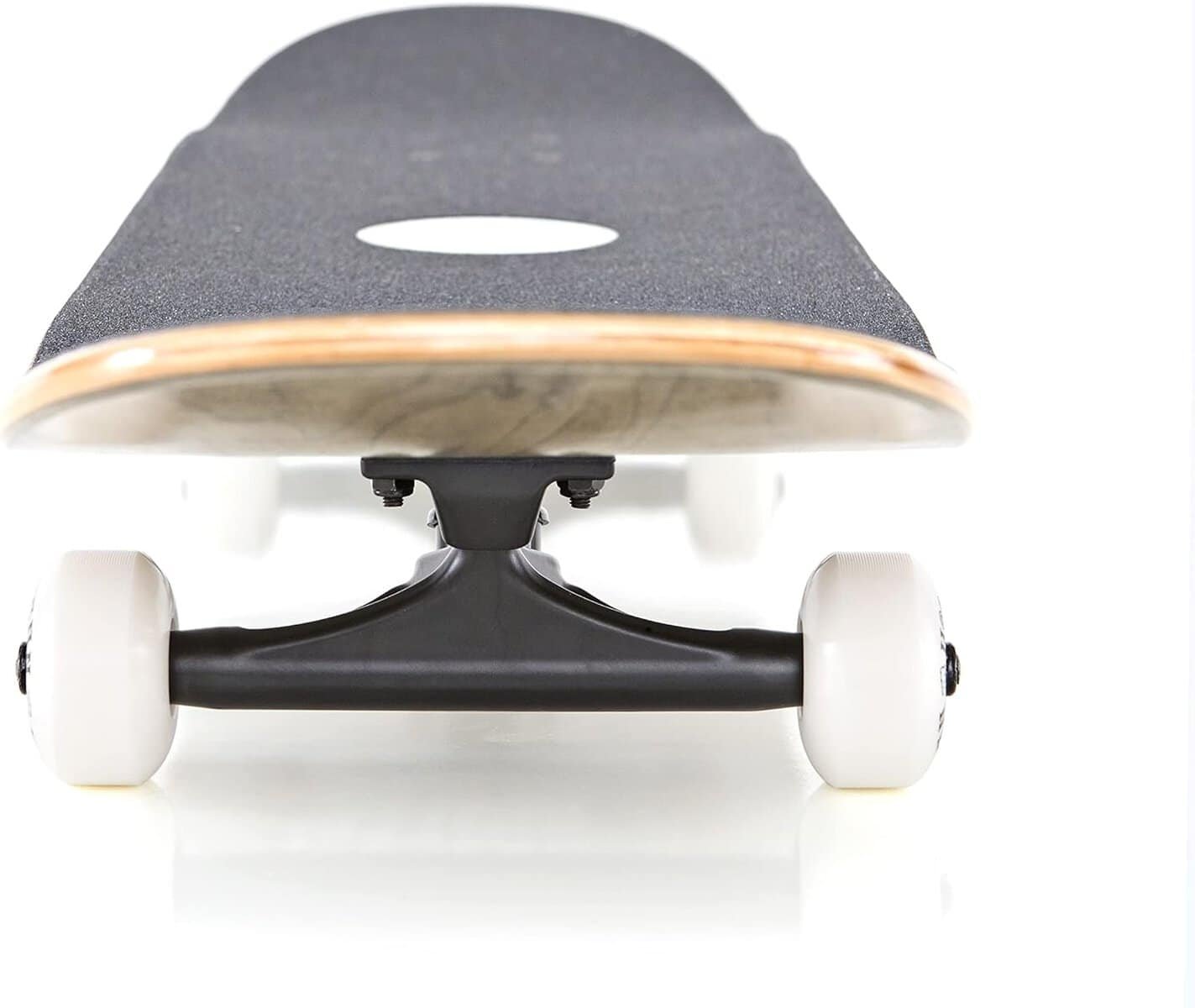 The White Wave Skateboard features 5.5-inch aluminum trucks with a matte black finish, providing stability while maintaining a lightweight feel. The ultra-high rebound bushings offer a smooth ride and excellent turning responsiveness.